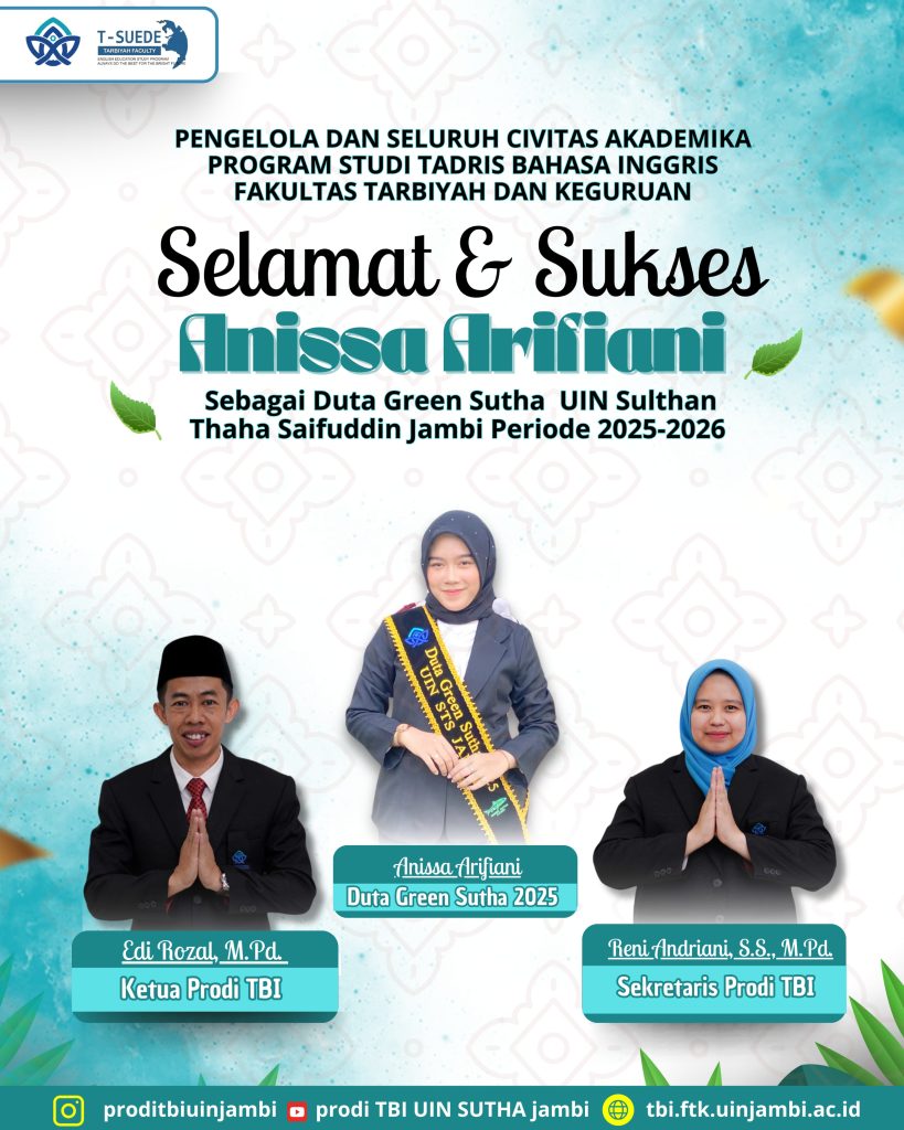 Jambi, 9 Juli 2025 – Anissa Arifiani, mahasiswa semester 4 Program Studi Tadris Bahasa Inggris (TBI) UIN Sulthan Thaha Saifuddin Jambi, terpilih sebagai Duta Green untuk tahun 2025. Pemilihan Anissa ini dilakukan melalui proses seleksi ketat dan menunjukkan komitmen tinggi terhadap pelestarian lingkungan dan keberlanjutan di kampus.