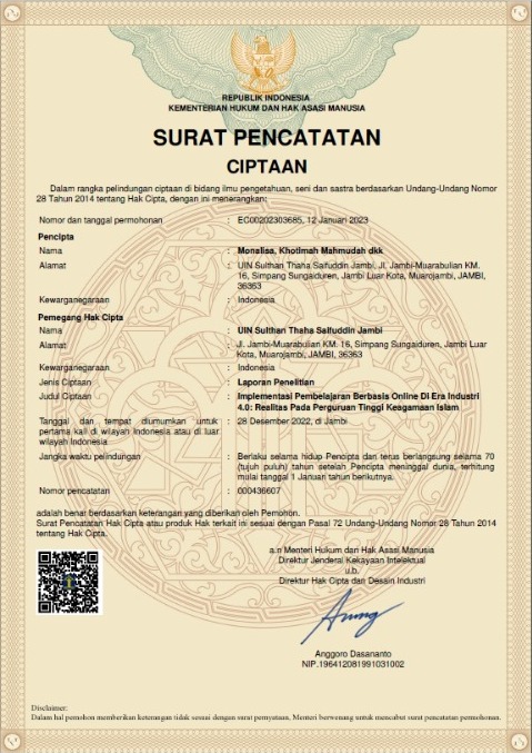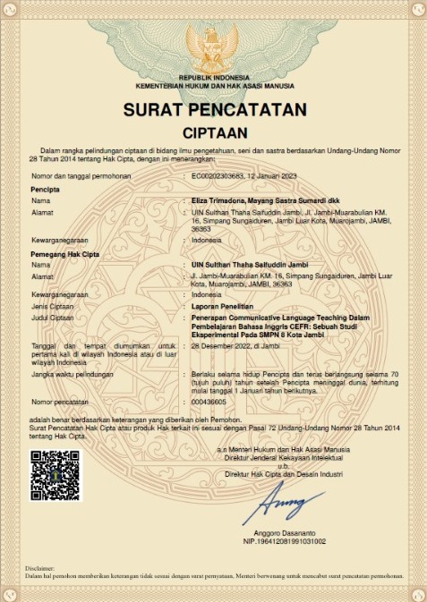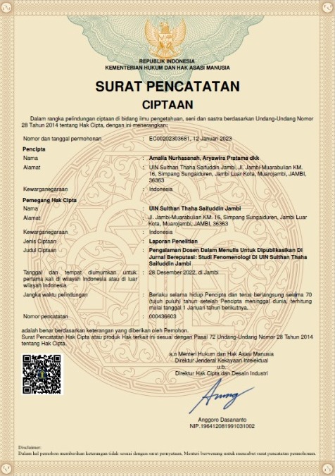 Jambi 12 Januari 2023. Prodi Tadris Bahasa Inggris mematenkan 4 hasil penelitian yang selesai dibulan Desember tahun 2022. Paten tersebut diharapkan untuk dapat menjaga originalitas dari penelitian tersebut. Hak paten bukanlah hal yang baru didunia penelitian dan pendidikan. Hak kekayaan intelektual (HKI) didefinisikan sebagai hak untuk memperoleh perlindungan secara hukum atas kekayaan intelektual sesuai dengan peraturan perundang-undangan di bidang HKI. Alhamdulilah proses pematenan ini diperoleh tanpa hambatan.